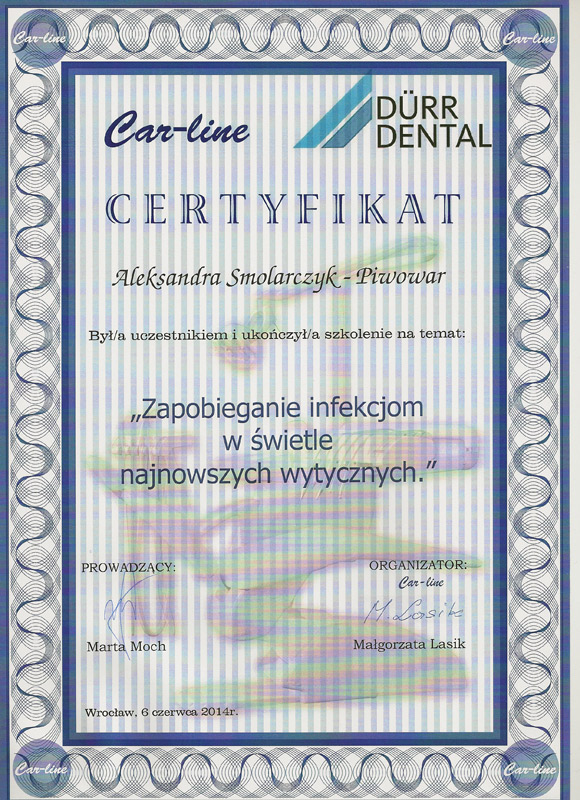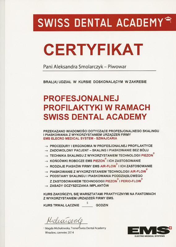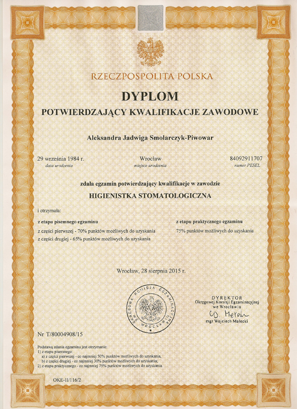 Dyplomowana asystentka i higienistka stomatologiczna, uzyskała kwalifikacje zawodowe w 2011 i 2015 roku. Wykonuje zabiegi w zakresie profilaktyki: usuwanie osadu i kamienia nazębnego, piaskowanie, fluoryzacja, lakowanie i lakierowanie zębów, przeprowadza wizyty adaptacyjne u najmłodszych pacjentów, prowadzi instruktaże dotyczące prawidłowej higieny jamy ustnej, zarówno u dzieci jak i u dorosłych, wykonuje zabiegi stomatologii estetycznej, takie jak wybielanie zębów. Swoje obowiązki służbowe wykonuje z wielkim zaangażowaniem i nienaganną starannością, o bardzo pogodnej osobowości, ciesząca się wielką sympatią wśród pacjentów. Swoim profesjonalizmem i serdecznością służy Państwu zawsze pomocą, z wyjątkową troską poświęca swój czas dzieciom. Stale podnosi swoje kwalifikacje uczestnicząc w licznych kursach i szkoleniach zawodowych.