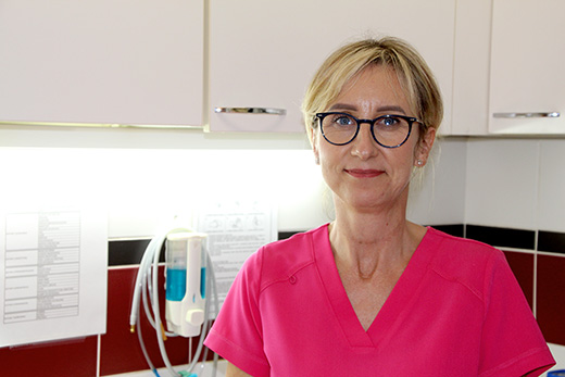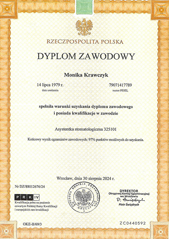 Dyplomowana asystentka stomatologiczna, kwalifikacje zawodowe uzyskała w 2024 roku. Niezwykle zaangażowana w pracę zawodową, swoje obowiązki wykonuje z pasją i nienaganną starannością. Osoba otwarta na innowacje i idealnie sprawdzająca się w pracy zespołu stomatologicznego, o niezwykle miłej powierzchowności i pogodnym usposobieniu, zdobywa sobie sympatię pacjentów.